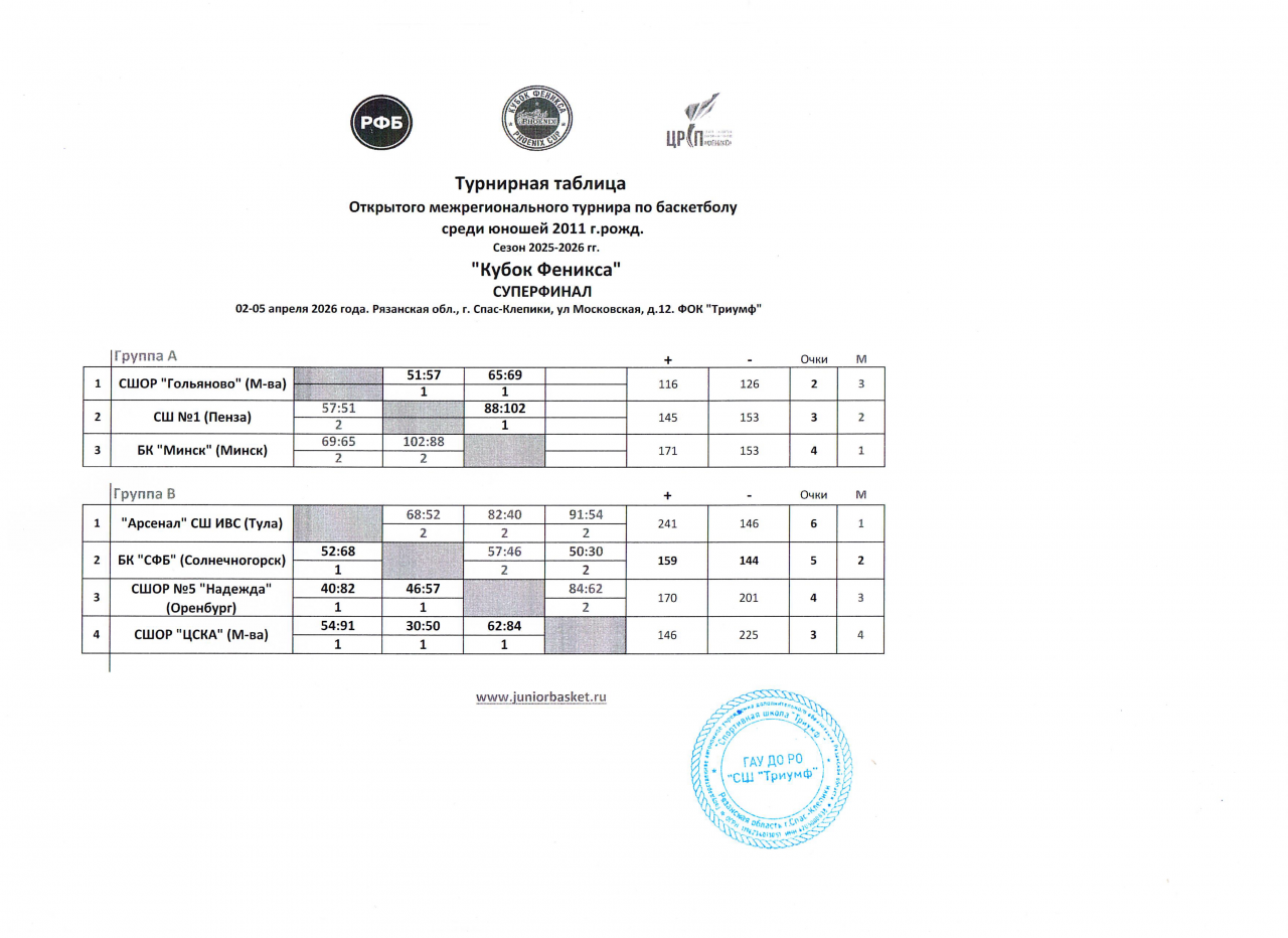 С 2 по 5 апреля в городе Спас-Клепики на базе физкультурно-оздоровительного комплекса «Триумф» состоялся суперфинал Открытого межрегионального турнира по баскетболу «Кубок Феникса» сезона 2025–2026 гг. В соревнованиях приняли участие юноши 2011 года рождения, представлявшие ведущие спортивные школы России и Беларуси. Турнир стал настоящим праздником спорта, а его главной сенсацией и триумфатором стала команда из Тулы.